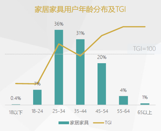 在家居家具行业中,80-95后是主力军,家居家具用户年龄高度集中在25-54岁之间,占比近9成,其中25-34岁是家居家具行业的主力军,占比高达36%,且TGI较高。