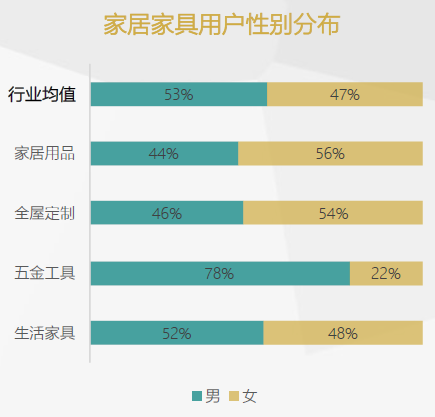 家居家具行业的男女比例为53%:47%,男性比重略高,但在全屋定制、家居用品两个细类中女性占比高于男性,而五金家具决策主要靠男性。