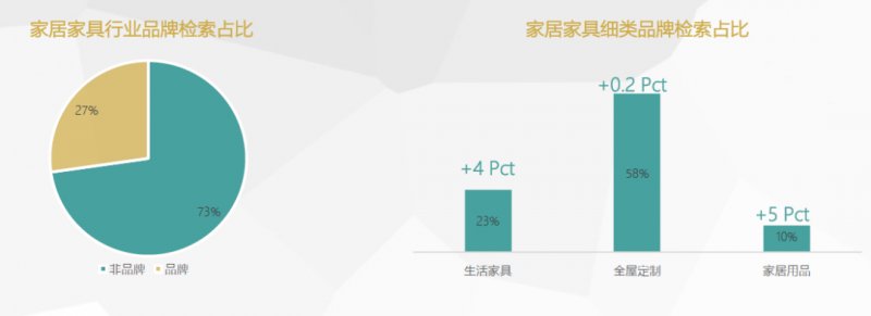 决策关注点方面,家居家具行业品牌关注度为27%,生活家具、全屋定制及家居用品三个细分行业的品牌关注度都有不同程度的提升;生活家具品牌检索占比23%,增加了4Pct;全屋定制品牌相关检索占比高达58%,家居用品的品牌关注度提升至10%。