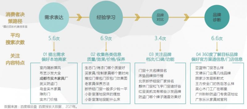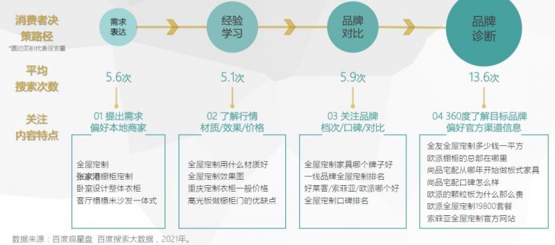 经过20年的发展,用户对定制家居有一定的了解,且接受度较高。大数据显示,用户带着明确的品牌需求来到百度平台,最重视目标品牌诊断,平均检索次数高达13.6次,远高于其他环节;