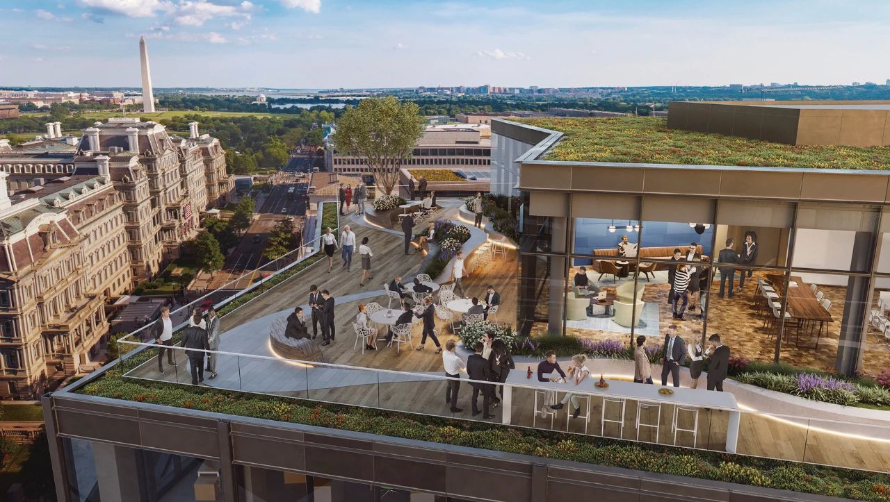 该重新定位项目旨在将一座乙级办公楼改造成一流的办公空间。通过外包工艺, 门窗布局变得更加优雅兼具纪念意义, 新建楼层和可供居住的顶层套房仍保留建筑原有特征, 身处其中, 依然可以欣赏到白宫景观, 这同时也是这栋建筑最大的特色。——宾夕法尼亚大道1700号—重新定位项目华盛顿特区