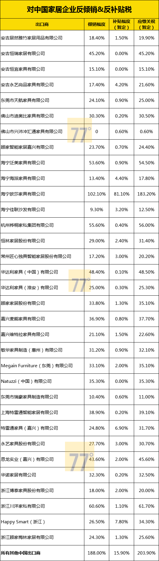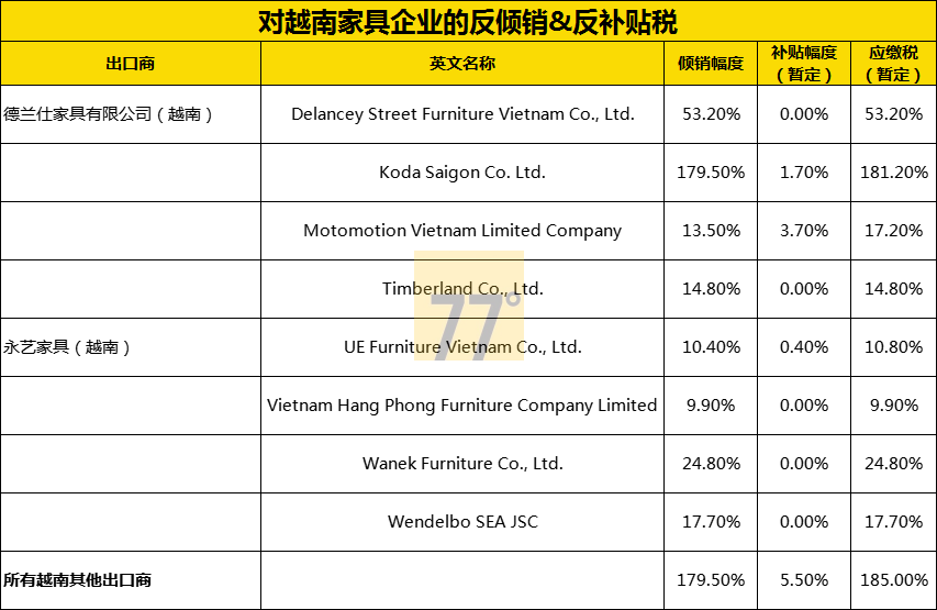 另外,32家中国制造商将以单独税率征收,幅度为9.3%至102.1%;8家越南制造商将被以单独税率征收,幅度为9.9%至179.5%关税。