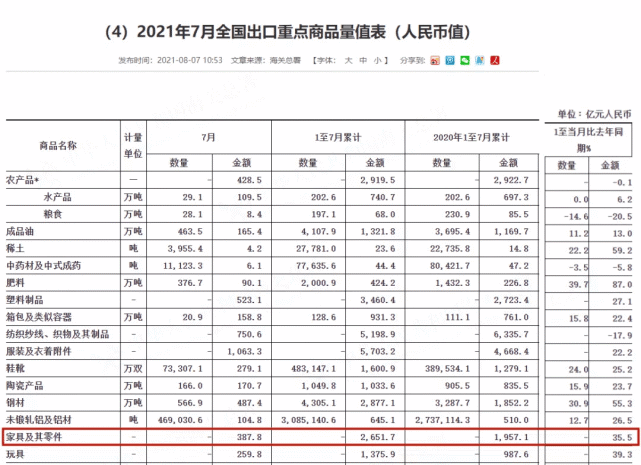 据海关总署2021年8月7日公布的最新数据,2021年7月,我国家具及其零件出口额为387.8亿元,1-7月出口总额为2651.7亿元;2020年7月,我国家具及其零件出口额为392.1亿元,2020年1-7月出口总额为1957.1亿元。今年1至7月出口总额比去年同期增长35.5%。