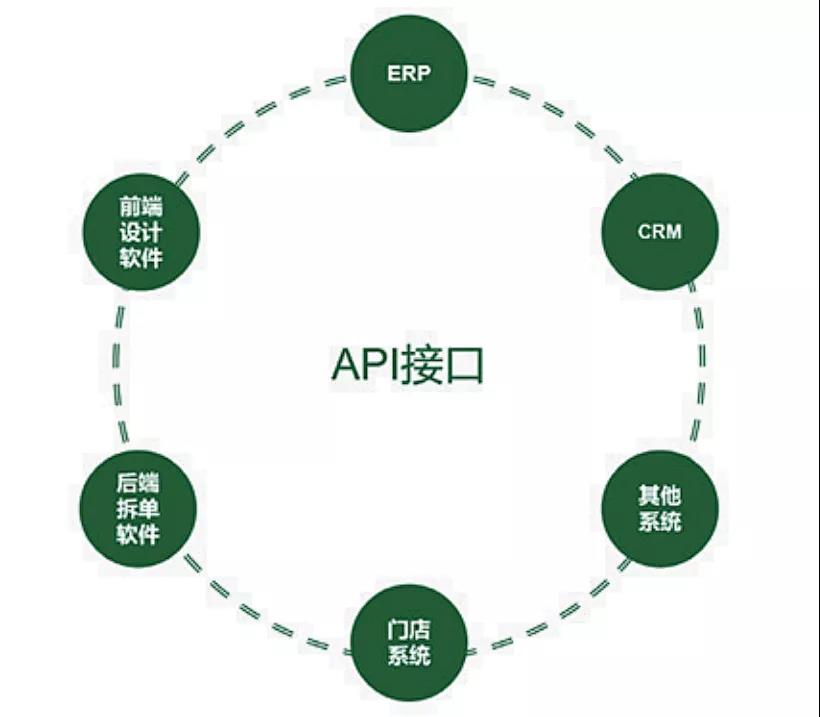 API接口能将设计软件、ERP、CRM以及拆单软件串联成一条完整的链路。通过JSON文档,实现数据的投送传递,解决了定制家具设计生产过程中各个软件系统信息独立的