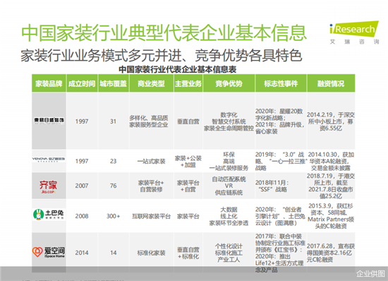 《2021中国家装行业研究报告》显示,当下家装行业主要呈现五大模式:以东易日盛为代表的提供多样化、高品质家装服务的“垂直自营”模式;以业之峰装饰为代表的提供一站式家装服务的“家装+工装+加盟”模式;以齐家网为代表的提供家装平台+自营装修服务的“家装平台+自营”模式;以土巴兔为代表的提供互联网家装平台服务的“家装平台”模式;以爱空间为代表的提供一站式整装服务的“垂直自营+标准化”模式;五种模式多元并进,竞争优势各具特色。