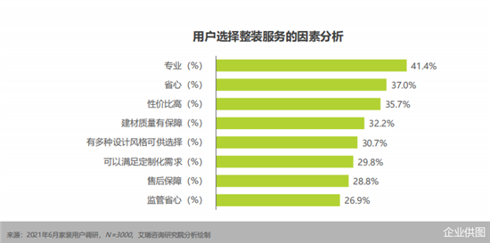 个性化需求浪潮来临,在业主购买力升级和审美水平不断提升的大趋势之下,能提供一站式“家的解决方案”,正成为大多数用户的首选;调研数据显示,选择整装企业的TOP3的原因是整装家装企业可以提供专业(占比达到41.4%)、省心(占比达到37.0%)及性价比高(占比达到35.7%)的装修产品和服务。与传统家装相比,整装服务的专业化水平更高,用户装修体验更佳。艾瑞咨询认为,未来标准化、专业化的整装服务会成为装企竞争的焦点。