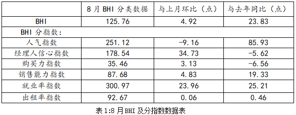 分析BHI各分指数情况:8月BHI环比唯一下跌的分指数为“人气指数”,环比下跌9.16点,但与去年同比仍上涨85.93点。