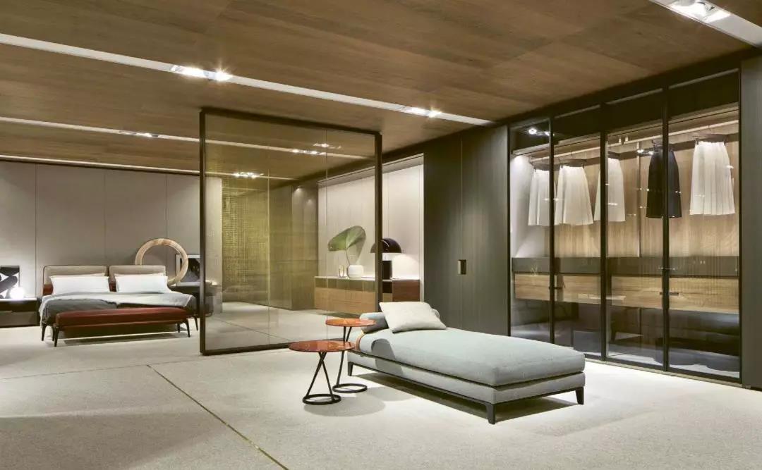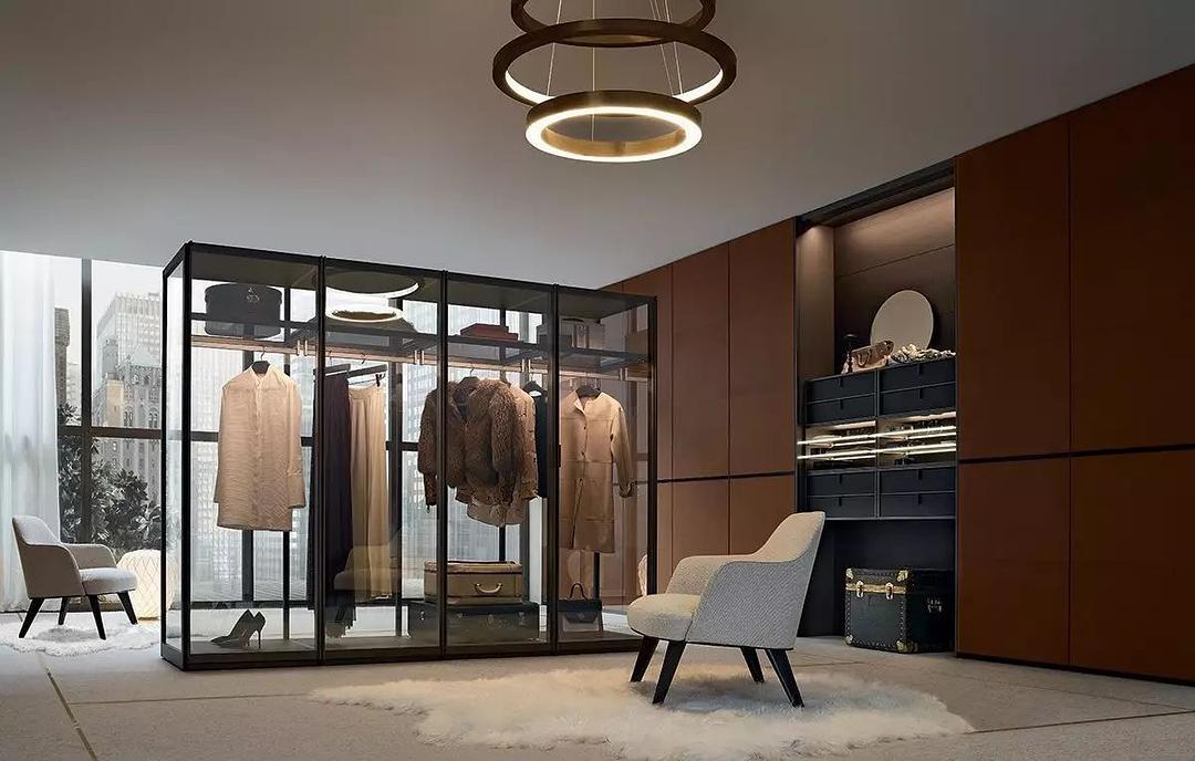 玻璃质感通透,兼顾实用性和美观度,不仅在无形中扩大了衣帽间的空间,增加层次感,同时给人梦幻、精致的感觉。