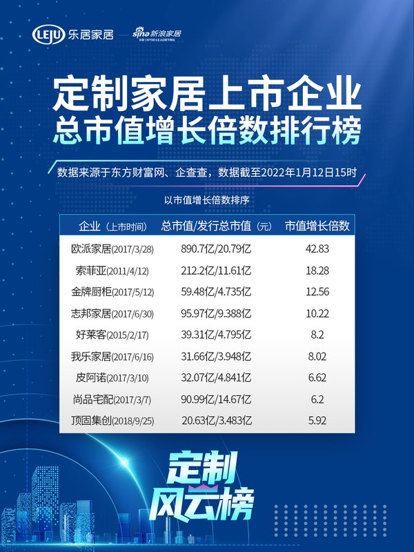 在家居行业中,上市企业的动态一直被广泛关注,他们不论在规模、产值或是品牌影响力方面均是行业风向标般的存在。2021年末至今,各大定制上市企业纷纷发布对于2022年的全新战略规划,为市场注入新的活力与期待:欧派家居、索菲亚、志邦家居、金牌厨柜、尚品宅配、好莱客、皮阿诺、我乐家居、顶固集创——新浪家居定制家居频道汇总截至2022年1月12日15时九大上市定制企业在东方财富网中所示总市值,对比其上市总市值,用数据说话,从「定制家居上市企业总市值增长倍数排行榜」看2022定制行业开年起点!