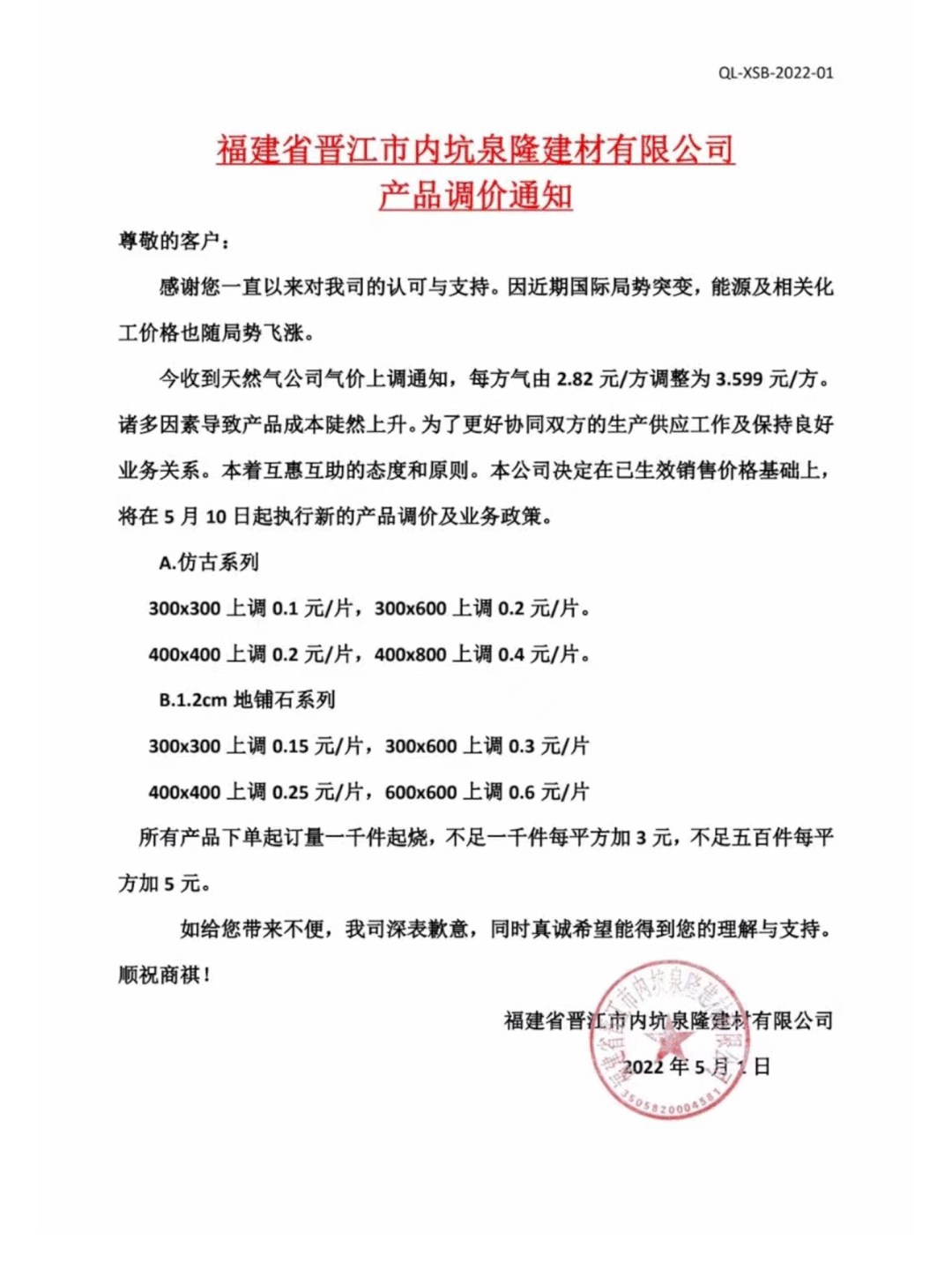 受此影响,陶瓷企业不得不跟着涨价。据初步了解,目前福建已有国达、中荣、泉隆、亿荣、利兴、阿博制造、尊威、超盛等企业相继发出涨价通知。此外,还有部分企业提示,新一轮瓷砖涨价将到来,需补货的客户要抓紧。