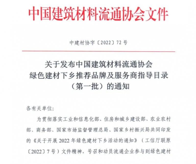 6月21日,建筑材料流通协会发布红头文件《关于发布建筑材料流通协会绿色建材下乡推荐品牌及服务商指导目录(第一批)的通知》(中建材协字〔2022〕72号)。