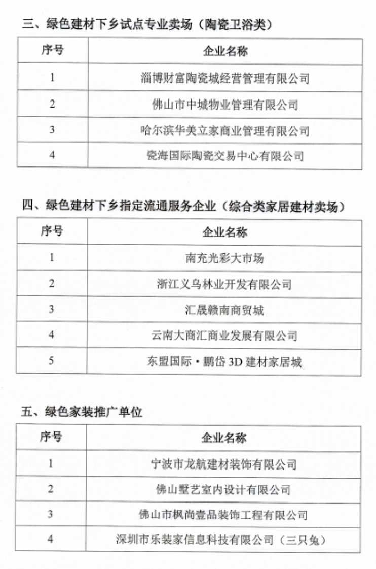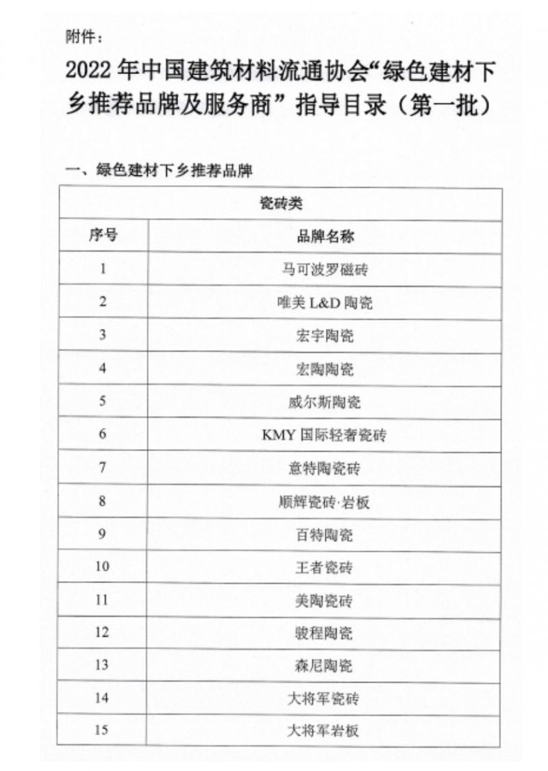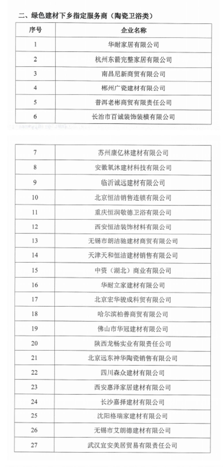 根据指导目录,入围第一批“绿色建材下乡推荐品牌”包括马可波罗、箭牌、恒洁、宏宇、顺辉、大将军、新润成、壹加壹、汇强、浪鲸、新岩素、大角鹿、兴辉、圣堡龙、白兔瓷砖、理想卫浴等41家行业知名陶瓷卫浴品牌;入围第一批“绿色建材下乡指定服务商”包括华耐家居、杭州东箭等27家经销服务商;入围第一批“绿色建材下乡试点专业卖场”包括淄博财富陶瓷城、佛山陶瓷城、华美立家、瓷海国际等4家国内知名卖场。详细名单见附件。