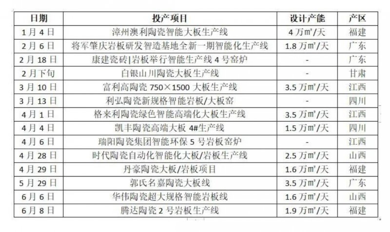 6月,山西、福建两个产区相继投产大规格岩板生产线。2022年,从投产区域来看,广东产区经过2019-2020年岩板线的快速扩张之后,新线增长已经趋于平稳。