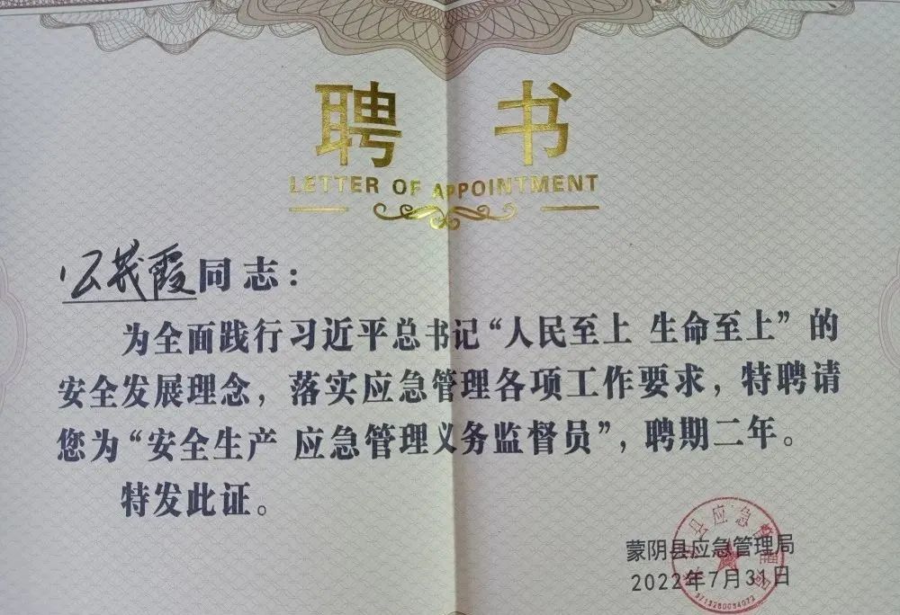 为全面践行习近平总书记“人民至上 生命至上“的安全发展理念,落实应急管理各项工作要求,9月7日,蒙阴县应急管理局相关领导莅临水波尔家居有限公司,特聘公司董事长公茂霞同志为“全县安全生产应急管理义务监督员”,有权监督全县的安全、应急工作,并授予聘书。