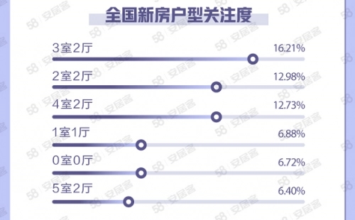 新房三室两厅关注度最高,达到16.21%,二室两厅关注度达到12.98%。