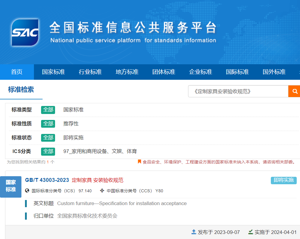 近日,GB/T43003-2023《定制家具安装验收规范》(以下简称《规范》),经由国家市场监督管理总局、国家标准化管理委员会联合发布的《人民共和国国家标准公告》正式发布,将于2024年4月1日正式实施。