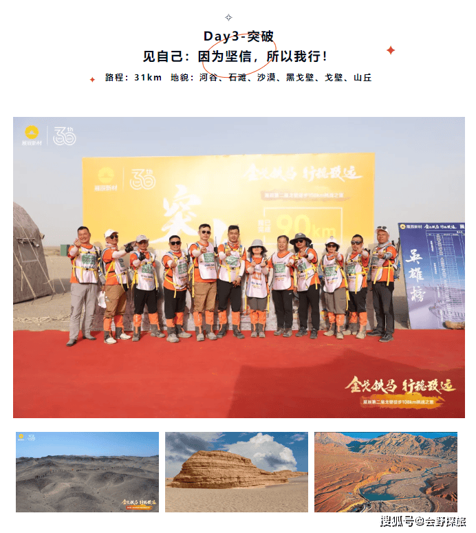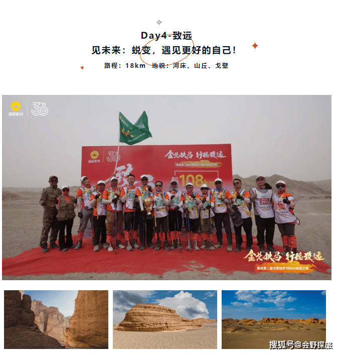 金戈铁马,行稳致远。5月24日-27日,由展辰集团主办,会野探旅承办的【展辰第二届戈壁徒步108km挑战赛】圆满举办。在展辰集团副董事长、展辰戈2赛事主席陈寿生先生的带领下,近百名展辰勇士一起走进敦煌戈壁大漠,历经四天三夜的长途跋涉,见天地、见众生、见自我、见未来。