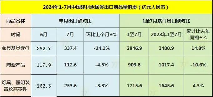 聚焦到建材家居行业,前7个月,家具及其零件出口额保持强劲的增长势头,灯具/照明装置及其零件出口额稳定增长,陶瓷产品出口额继续下滑,下滑幅度进一步扩大。数据显示,1-7月,家具及其零件出口额为2846.9亿元,同比去年增长14.8%;灯具/照明装置及其零件出口额为1715.6亿元,同比增长4.3%;陶瓷产品出口额为909.8亿元,同比下滑10.6%。