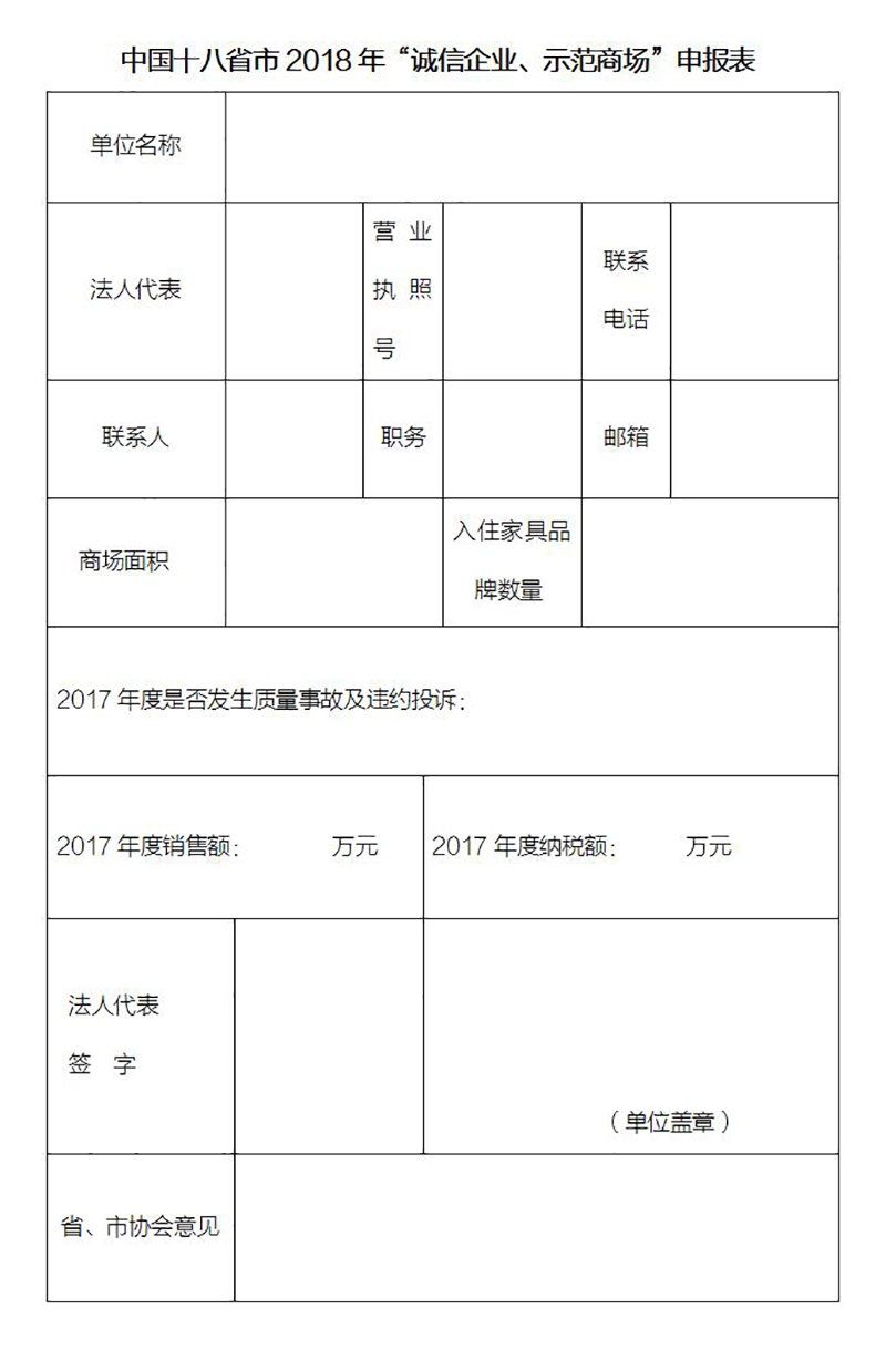 关于开展2018年中国十八省市家具行业“诚信企业、示范商场”推荐活动的通知