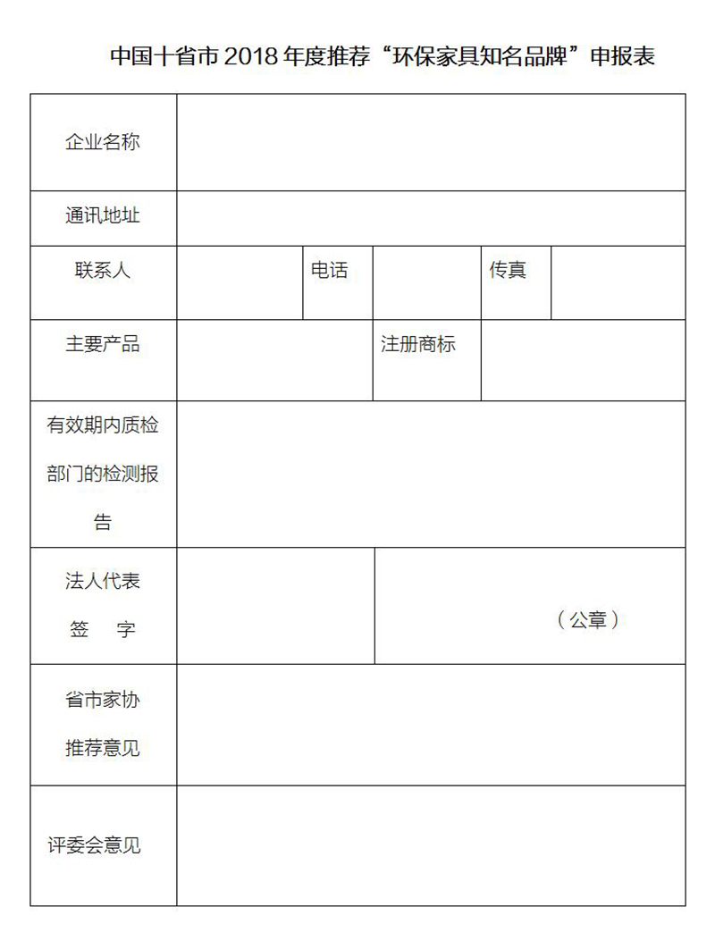 1、企业填写申报表于2月15日前报省家协并进行样品检验,合格者出具省级检验机构的检测报告,经十省市家具协会联合评审后,最终确认2018年“中国十省市环保家具知名品牌”。