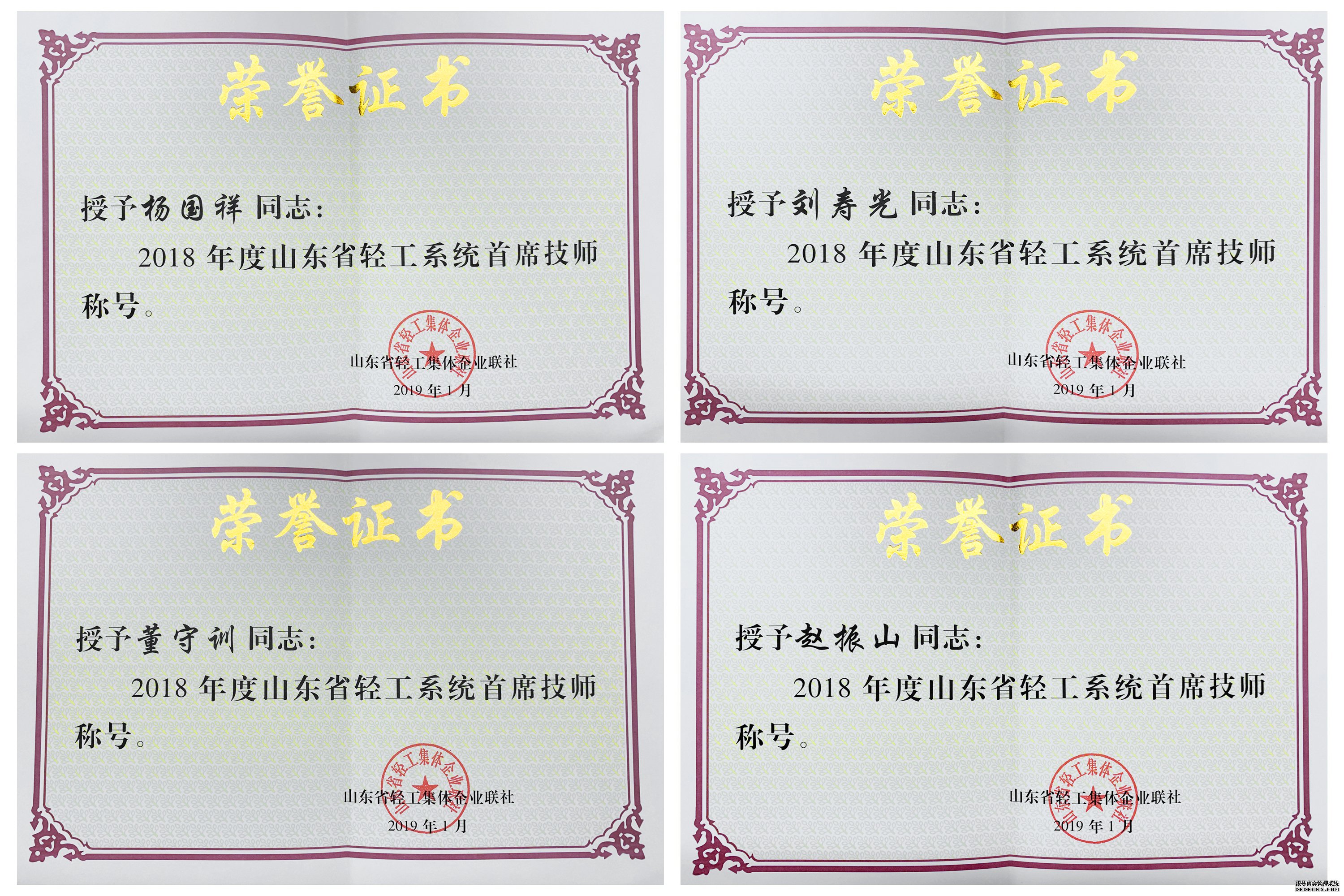 为大力实施人才强省战略,加强高技能人才队伍建设,充分调动广大技能劳动者学技能、比贡献的积极性和创造性,经由山东省家具协会推荐,专家评审,省轻工联社高技能人才队伍建设领导小组审核同意,授予山东家具行业家具制作技师杨国祥、刘寿光、董守训、赵振山等4人“2018年度山东省轻工系统首席技师”荣誉称号。