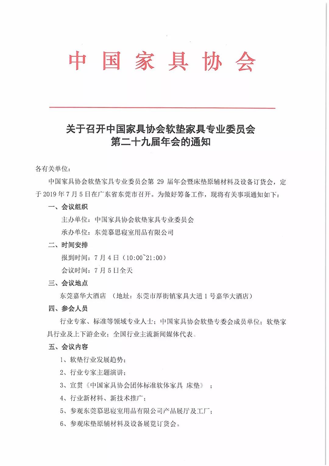 中国家具协会:关于召开中国家具协会软垫家具专业委员会 第二十九届年会的通知