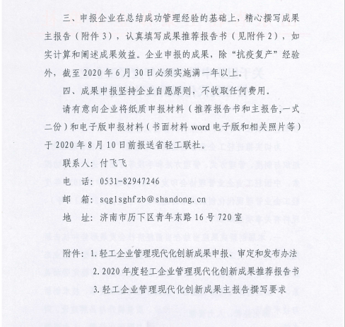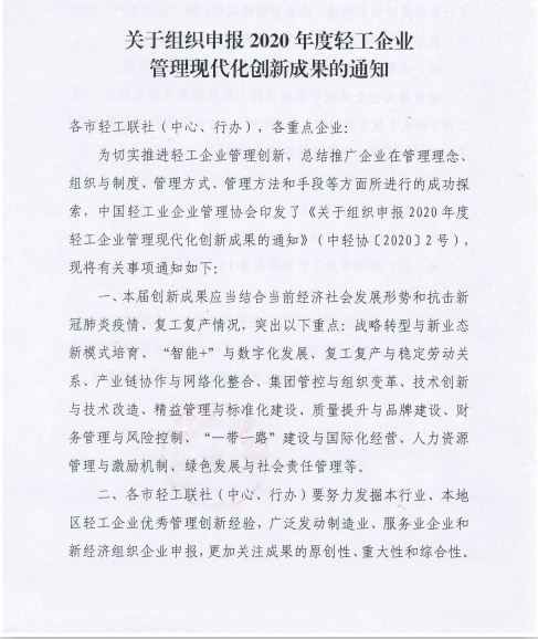 【转发】关于组织申报 2020年度轻工企业管理现代化创新成果的通知