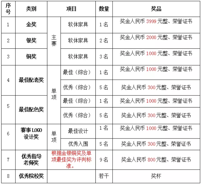 本次大赛设立金奖、银奖、铜奖、最佳配色奖、最佳配套奖、最佳LOGO设计奖、优秀指导老师奖、优秀院校等奖项,获奖作品均颁发证书、奖品。