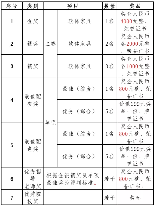 奖项及奖品设置本次大赛设立金奖、银奖、铜奖、最佳配色奖、最佳配套奖、优秀指导老师奖、优秀院校等奖项,获奖作品均颁发证书、奖品。