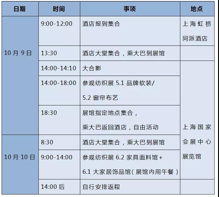 “2021年中国国际家用纺织品及辅料(秋冬)博览会”即将于10月9日在上海国家会展中心展馆开幕,为解决实木家具高定软包、沙发高新面料选购难问题,协会组织会员企业于10月9日-10日参观2021上海纺织展,具体行程安排如下,请参观展会报名企业大家在规定时间到达指定酒店报到。