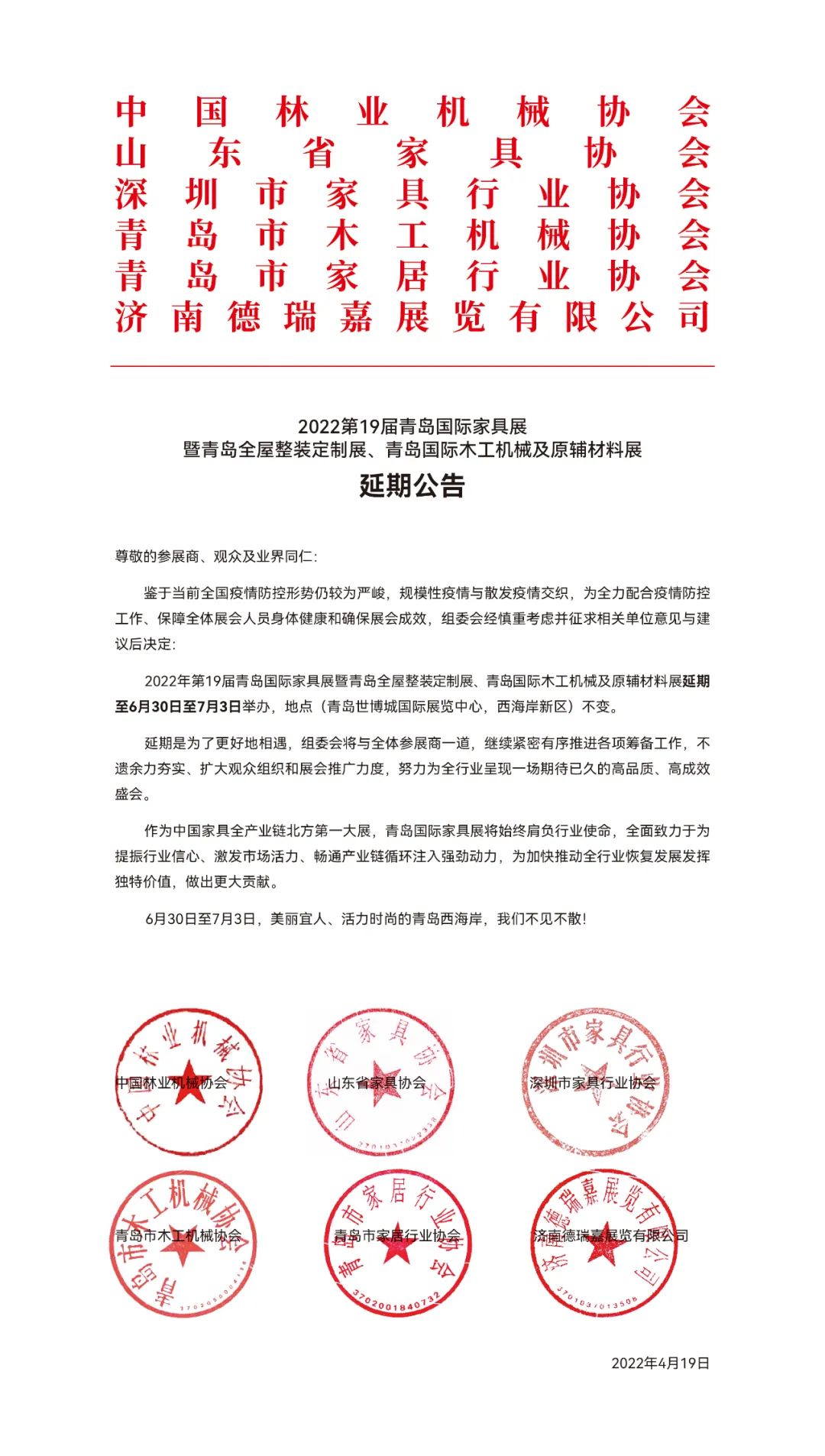 2022年第19届青岛国际家具展暨青岛全屋整装定制展、青岛国际木工机械及原辅材料展延期至6月30日至7月3日举办,地点(青岛世博城国际展览中心,西海岸新区)不变。