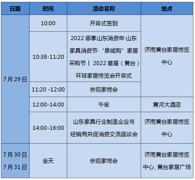 2022年中国·济南(黄台)环球家居博览会暨家装设计月将于2022年7月29日—7月31日在环球家居、黄台家居广场、黄台家居东区、黄台装材市场等同步举行,博览会集家具、建材、家电、卫浴、布艺、灯具、家装设计为一体的综合性大家居博览会。博览会倡导“绿色、环保、和谐、宜居”的消费理念,参展面积达70多万平方米,参展厂商来自国际、国内知名品牌数千个,活动纷繁,盛况空前,诚邀您的莅临!相关会议议程如下: