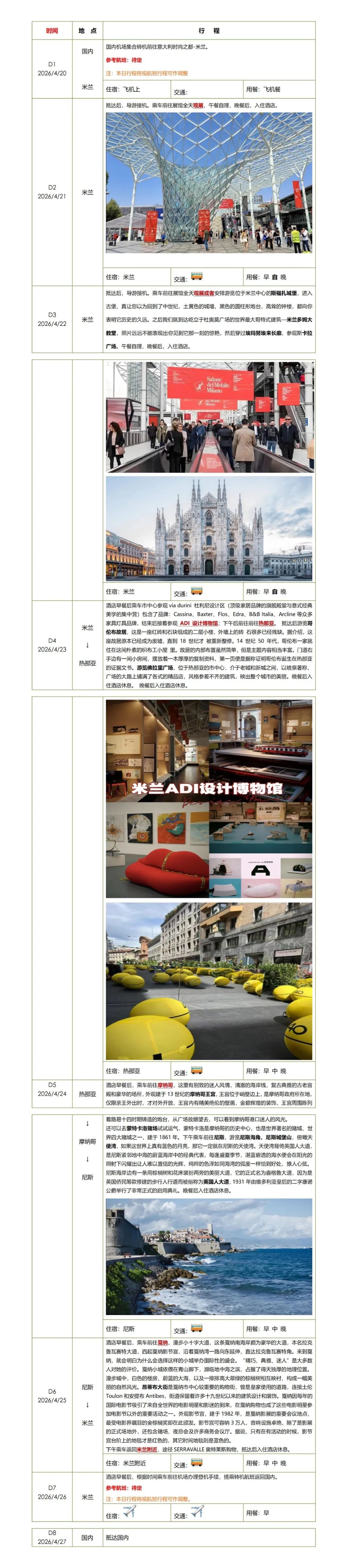 为加强国际交流与合作,帮助会员企业更好地把握市场动态和设计趋势,感受世界前沿的产品设计理念,提升我省家具行业的设计水平和市场竞争力。山东省家具协会计划于2026年4月20日-27日组织会员企业参观考察意大利米兰家具展,具体内容通知如下。