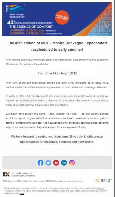 因目前新冠疫情持续全球蔓延,疫情形势走向尚不明朗,为了保证展商及观众有更好的参展体验,展会主办方决定将原定于2022年3月8-11日举办的意大利米兰国际舒适家居展览会延期至2022年6月28-7月1日在意大利米兰举行。