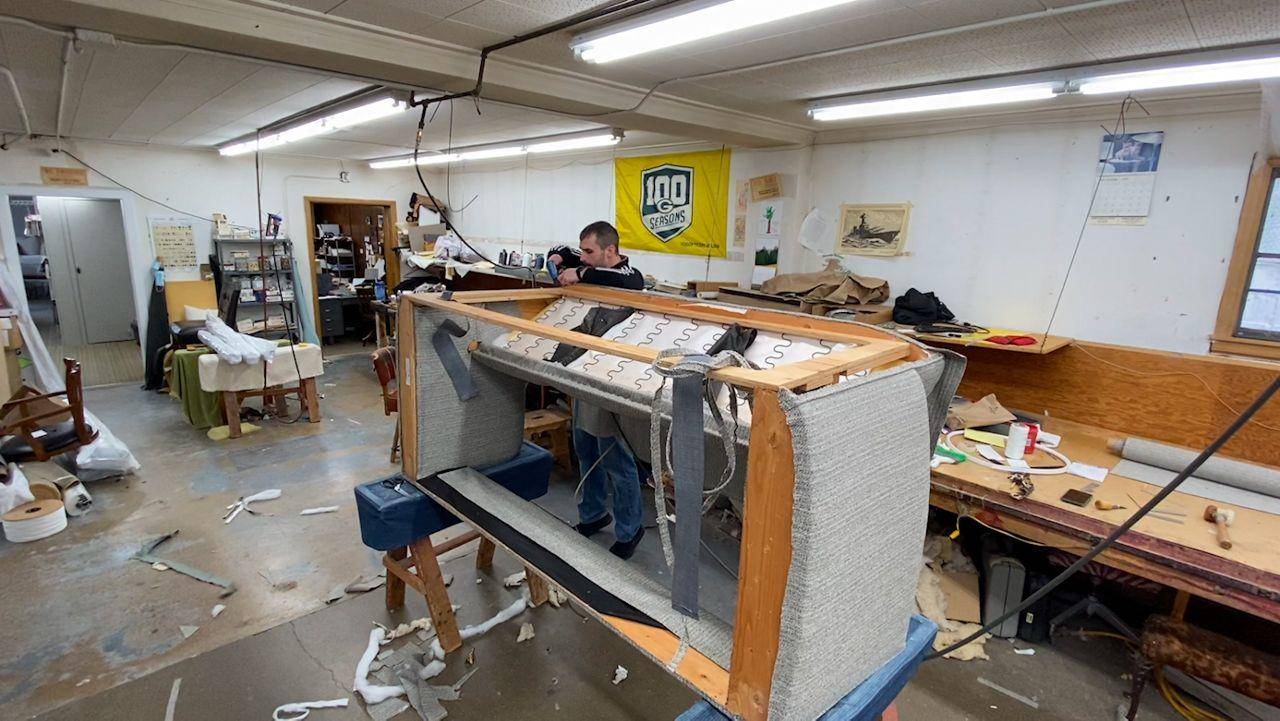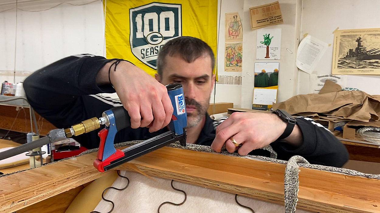 在美国绿湾的有着上百年历史的软垫家具翻新公司Green Bay Upholstering中,员工鲍勃·安格斯有节奏“咔哒”“咔哒”地用码钉枪给十年旧沙发进行翻新工作,使其焕然一新。