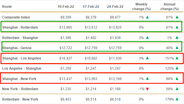 然而,根据宁波集装箱运价指数(NCFI)的显示,亚欧贸易航线的运费出现了“略微下降”,反映出“市场供应充足”。在跨太平洋航线上,NCFI的评论称,“一些航运公司在3月初的航行中提高了费率”。