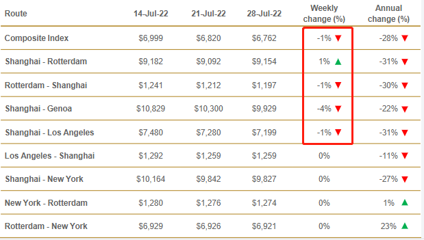德鲁里的世界集装箱运价指数(WCI)已连续22周下降,最新WCI综合指数周跌0.9%,至6761.63美元/FEU,较去年同期下跌28%。只有上海至鹿特丹的运费上涨1%即62美元至9154美元/FEU。德鲁里预计运价在未来几周内将继续下降。