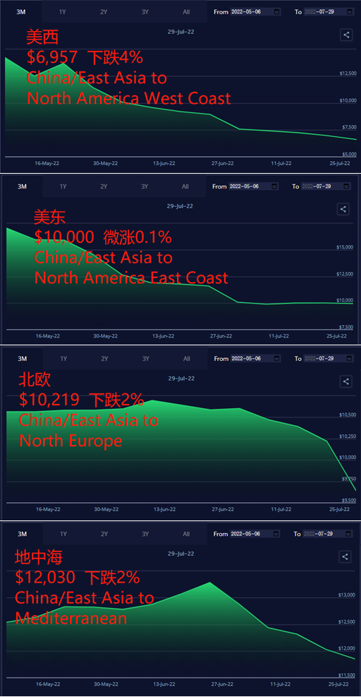 远东到美西下跌28美元至6694美元/FEU,跌幅0.4%;
