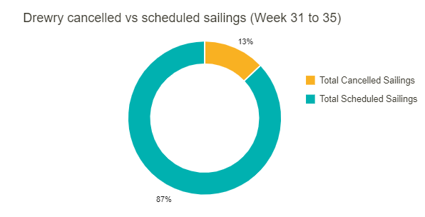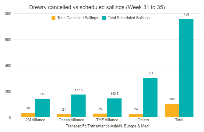 在跨太平洋、跨大西洋、亚洲-北欧和亚洲-地中海等主要航线总共756个预定航次中,在第31周至35周之间取消了100个航次,取消率为13%。根据德鲁里本期数据,在此期间,68%的空航将发生在跨太平洋东向贸易航线中。