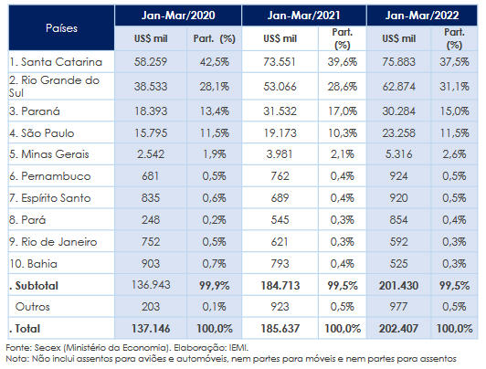 值得注意的是,巴西的家具和床垫制造业大多集中在南部地区。2022年第一季度,圣卡塔琳娜州(37.5%)、南里奥格兰德州(31.1%)、巴拉那州(15.0%)合计占巴西家具和床垫出口总额的83.5%,达到1.69亿美元。