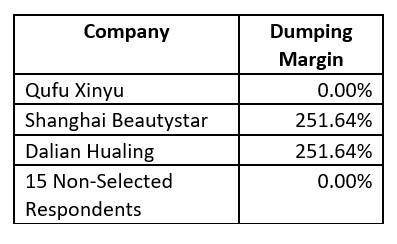 经过计算,强制应诉方曲阜新宇(Qufu Xinyu)的倾销幅度为零,强制应诉方上海杞孚(Shanghai Beautystar)的倾销幅度为251.64%,自愿应诉方大连桦岭木业(Dalian Hualing)的幅度为251.64%。另外,审查中其余的15家应诉企业与曲阜新宇一样,倾销差额为0。