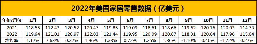 数据显示,2022年全年,美国家具及家居用品零售额达到1434亿美元,同比增长1%,在美国所有零售行业中增幅排名倒数。