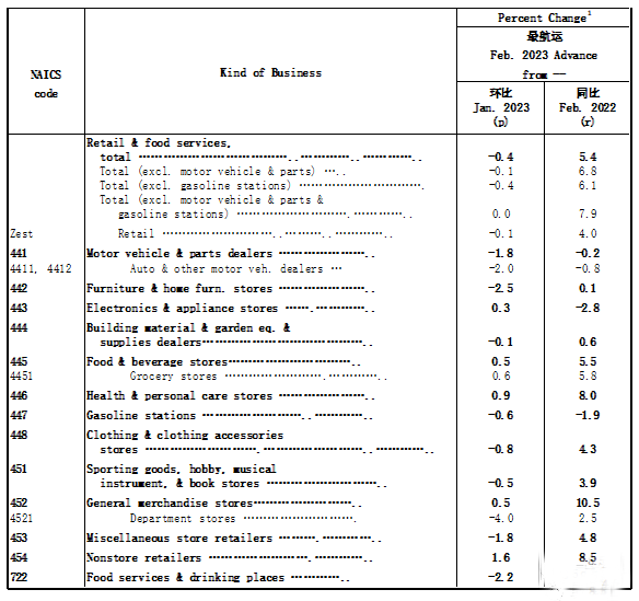 3月15日,美国商务部公布的数据显示,美国2月零售销售环比1月下降0.4%,与市场预期一致,修正后前值为3.2%。在13个零售品类中,有9个品类零售销售下降,其中家具零售销售下降2.5%,降幅最大。