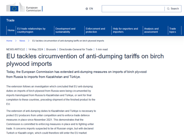 此前的一项深入调查揭示了俄罗斯桦木胶合板规避反倾销税的行为:即通过哈萨克斯坦和土耳其作为转运站,将俄罗斯原产的胶合板以较低的成本进入欧盟市场,从而给欧盟本土生产商带来了不公平的竞争压力。