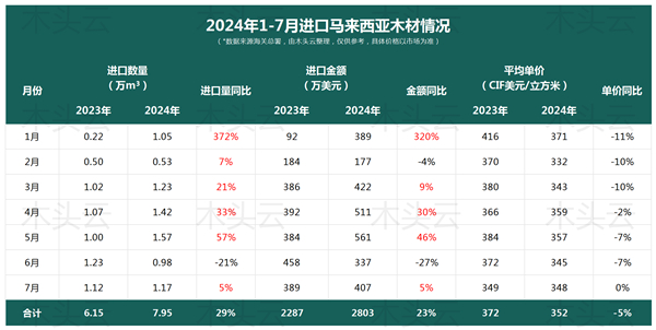 就对中国市场的木材出口而言,经历了6月份对中国木材出口下跌37.8%,7月马来西亚对中国的木材出口回暖。海关总署数据显示,7月中国自马来西亚进口的木材达1.17万立方米,对比6月增长19.8%。前7个月进口量增长29%;贸易额增长23%。