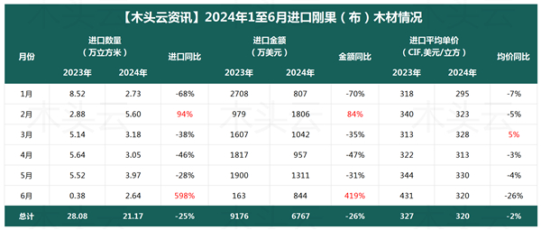 及至6月,虽然与去年同期相比,进口量实现了近6倍的增长,但从绝对数量上看,却是上半年中的最低水平。尤为值得注意的是,6月的木材进口单价同比大幅下降26%,进一步凸显了市场价格的压力。
