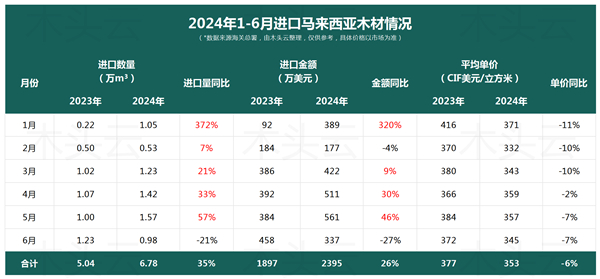 数据显示,2024年前6个月,中国从马来西亚进口的木材总量较去年同期增长了35%,进口总金额也实现了26%至2395万美元的显著增长。