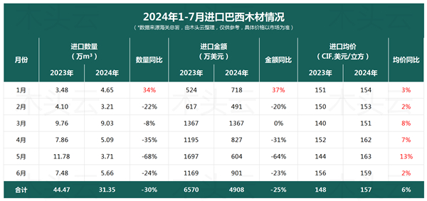 数据显示,2024年1月至6月期间,中国自巴西进口的木材总量为31.35万立方米,与2023年同期相比,降幅高达30%。在进口金额方面,同样出现了下滑趋势,总金额降至4908万美元,同比下降了25%。然而,在进口数量明显减少的背景下,木材的进口均价却逆势上升了6%,这一变化凸显了当前市场的复杂性和不确定性。