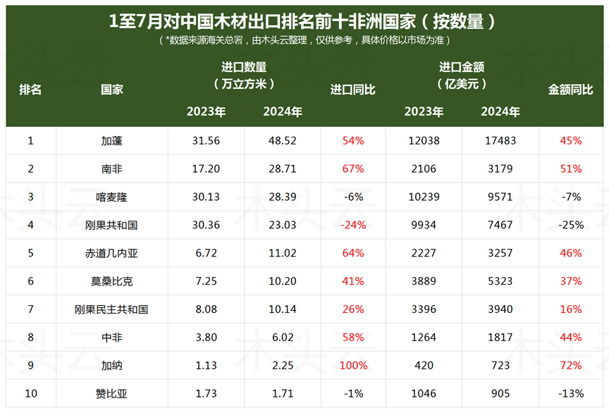 在供应端,加蓬作为非洲木材出口的主力军,持续保持对中国的正向增长态势,稳固了其市场地位。南非、赤道几内亚、加纳以及中非国家等也表现出明显的增长潜力。