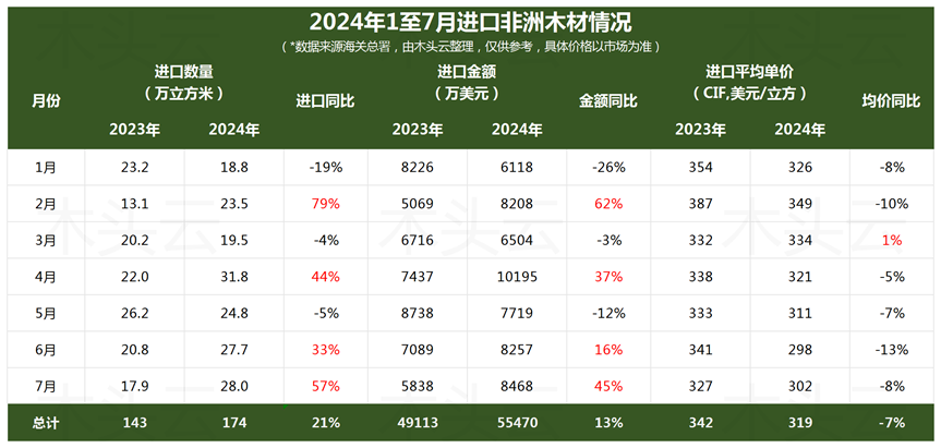 海关总署数据显示,2024年1至7月,非洲对中国木材出口量增长21%至174万立方米,贸易额也实现了13%的增长至5.54亿美元。特别是7月份,出口量激增57%至28万立方米,成为年内出口数量的高峰。尽管出口量有所增长,但平均进口单价(CIF)却较去年同期有所下降。